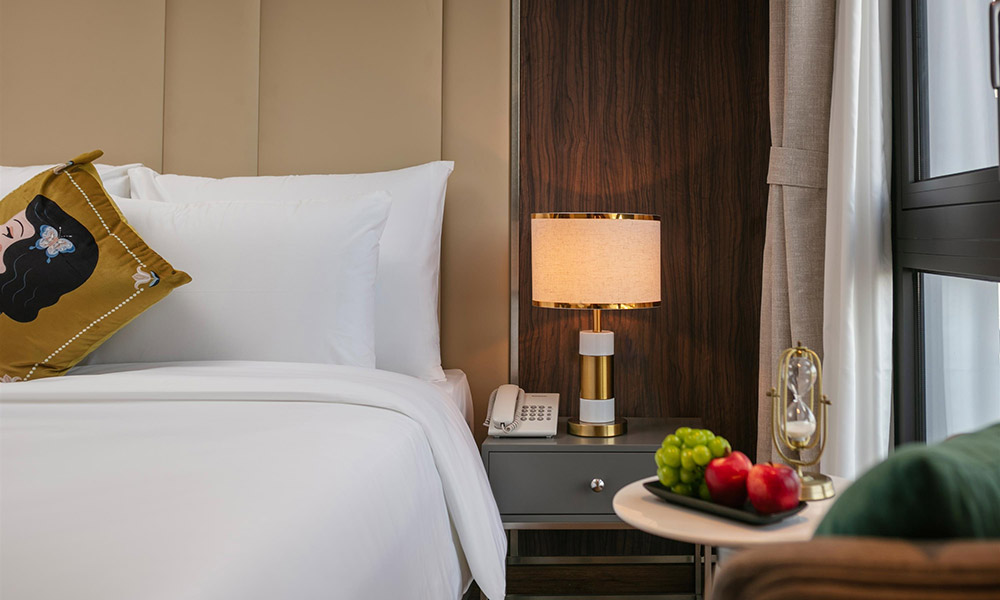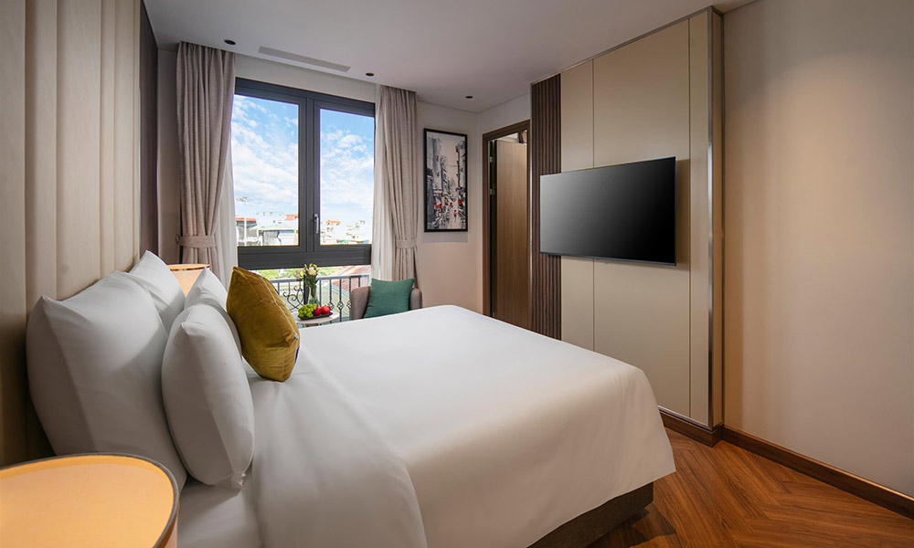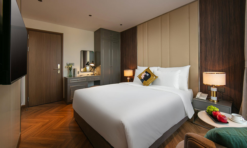 Căn phòng nổi bật với không gian được tối ưu hóa thông minh, tạo cảm giác rộng rãi và thoáng đãng. Điểm nhấn là chiếc giường Queen với ga trải giường trắng tinh khôi, mời gọi một giấc ngủ trọn vẹn. Ngay bên cạnh, hệ thống bàn làm việc và tủ đựng đồ được bố trí khoa học, đáp ứng mọi nhu cầu của bạn. Phòng tắm hiện đại với bồn tắm lớn ốp gạch men sang trọng, với gương tròn lớn và ánh sáng dịu nhẹ, tạo nên một không gian thư giãn tuyệt vời.