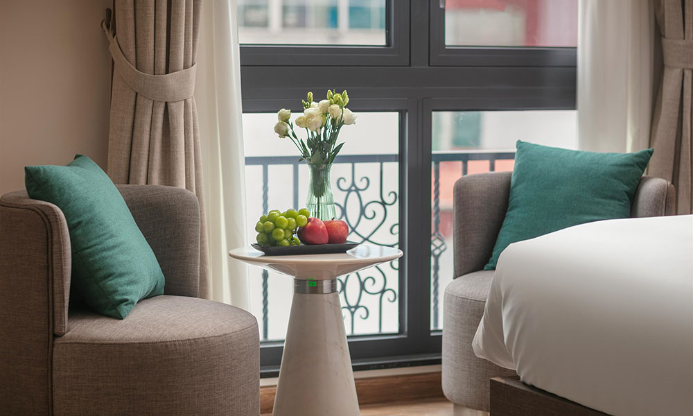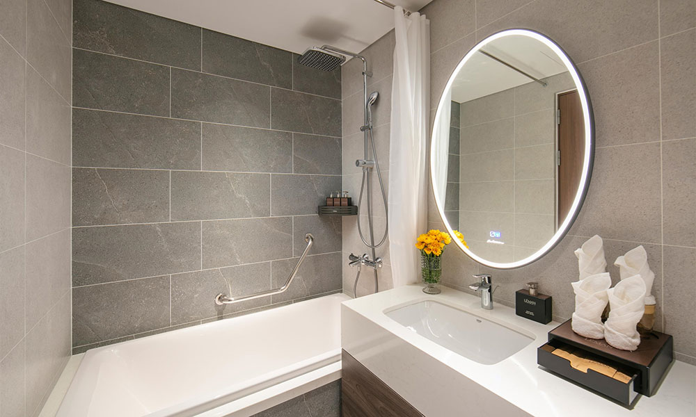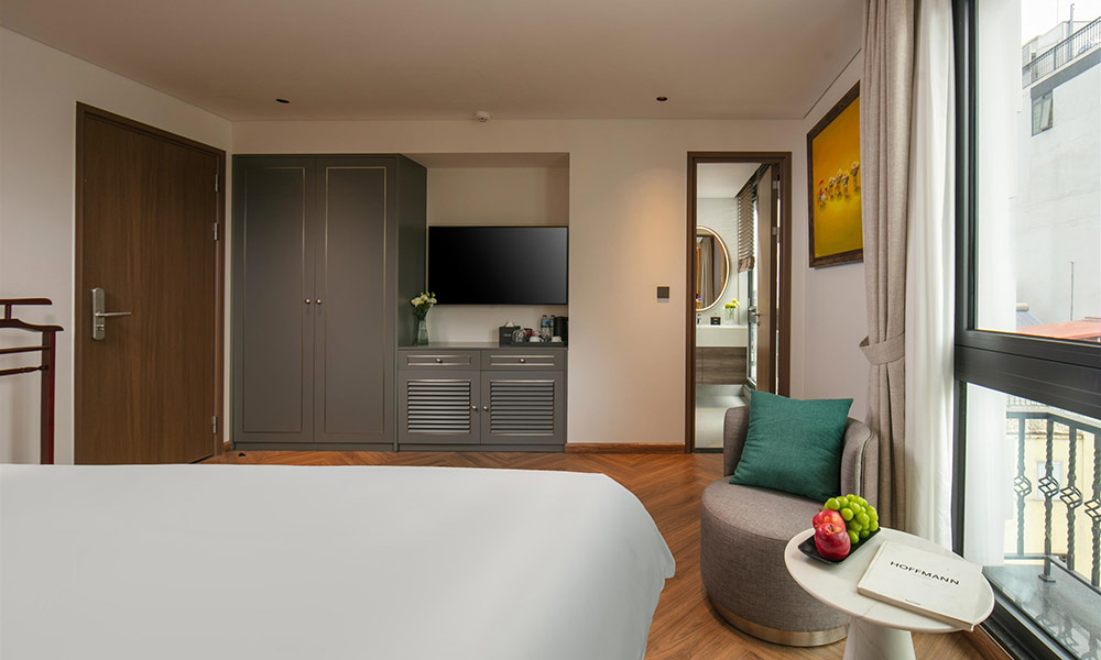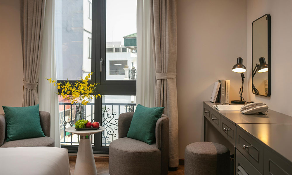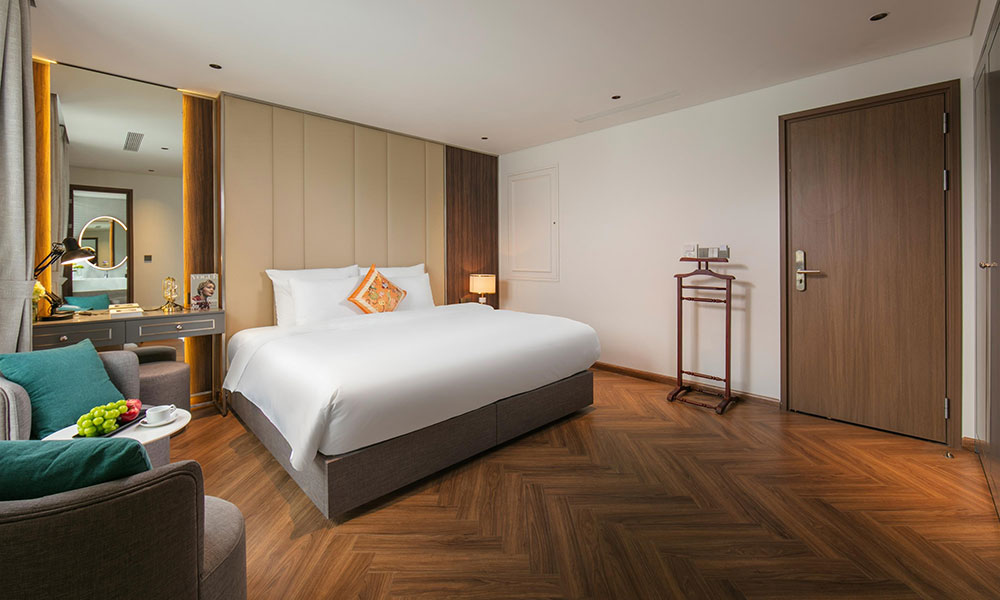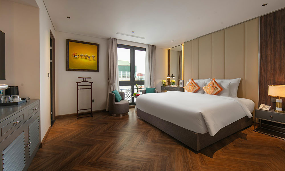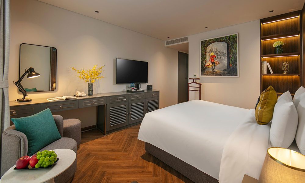 Phòng được trang bị giường King với đệm êm ái, bộ ga gối cao cấp và gối điểm nhấn màu vàng sang trọng. Khu vực bàn làm việc và bàn ghế tiếp khách nhỏ được bố trí hợp lý, kèm theo bình hoa tươi, mang lại không gian thư giãn đầy cảm hứng. Cửa sổ lớn mở ra góc nhìn thành phố, cho phép đón ánh sáng tự nhiên vào phòng. Tivi màn hình phẳng, kệ console hiện đại và hệ thống đèn chiếu sáng được thiết kế tinh tế, tạo bầu không khí ấm cúng. Phòng tắm riêng với bồn tắm sang trọng, gương viền sáng và đồ dùng vệ sinh cao cấp giúp bạn tận hưởng những phút giây thư giãn tuyệt đối.