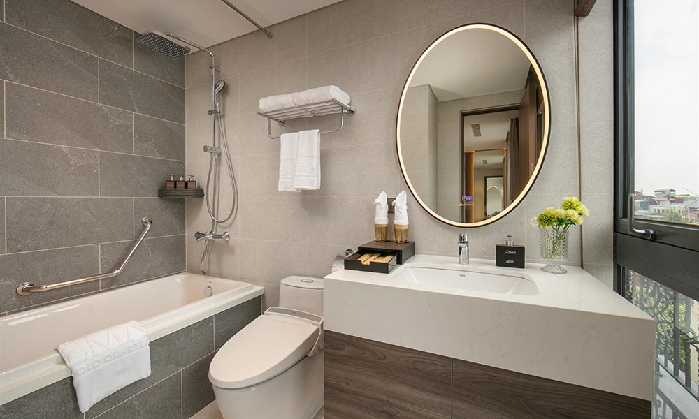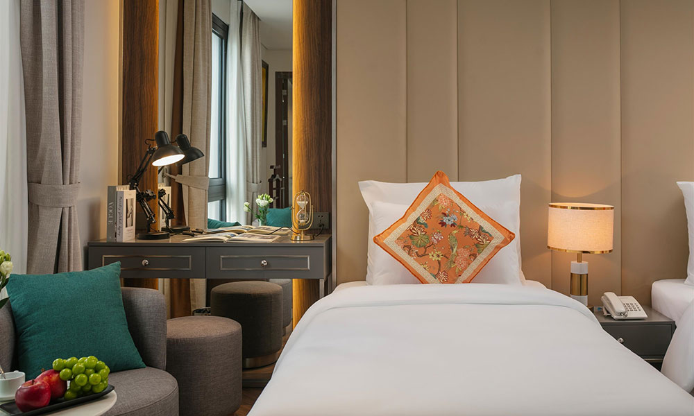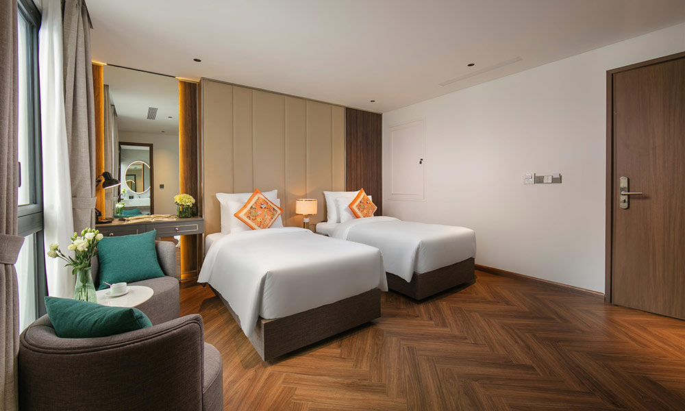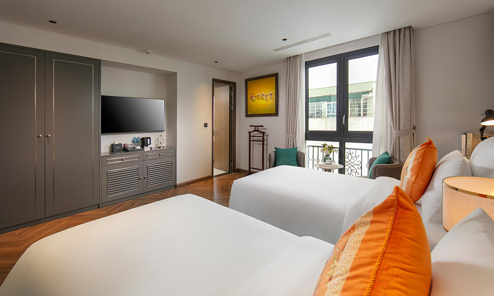Premier Twin mang đến không gian nghỉ dưỡng ấm cúng, lý tưởng cho các gia đình nhỏ hoặc nhóm bạn 2–3 người. Căn phòng được bố trí hai giường đơn với đệm dày, ga trải cao cấp và gối bông mềm mại, giúp cả người lớn lẫn trẻ em có giấc ngủ trọn vẹn. Tông màu ấm, trung tính kết hợp ánh sáng tự nhiên từ cửa sổ lớn hướng phố tạo cảm giác gần gũi, thư thái. Nội thất trong phòng được lựa chọn tinh tế, gồm bàn làm việc tiện lợi, tủ quần áo rộng, TV màn hình phẳng và giá treo đồ nhỏ gọn. Phòng tắm hiện đại được trang bị bồn tắm sang trọng, vòi sen đứng, cùng đầy đủ đồ dùng vệ sinh cá nhân cao cấp.