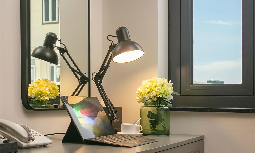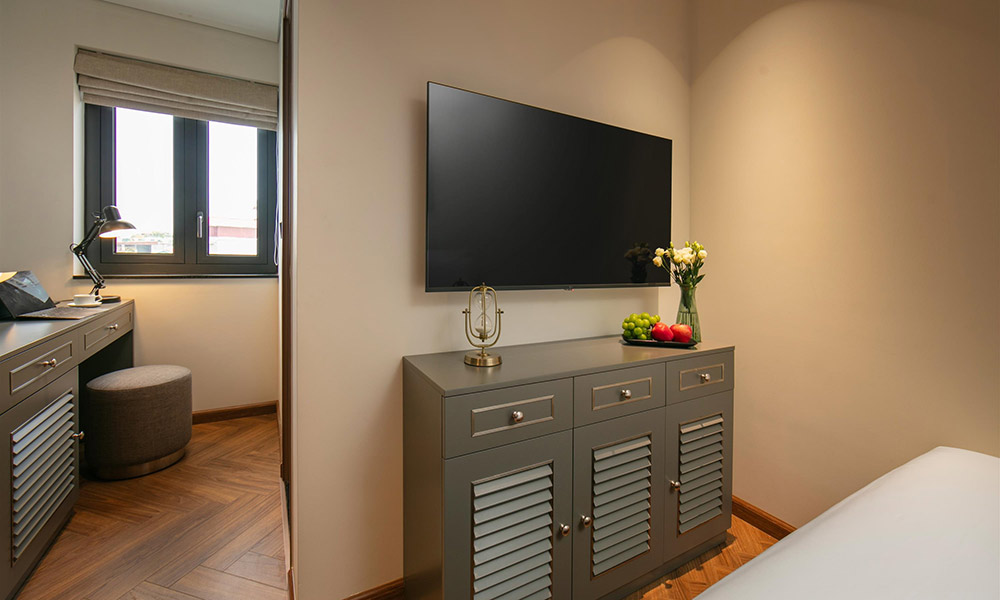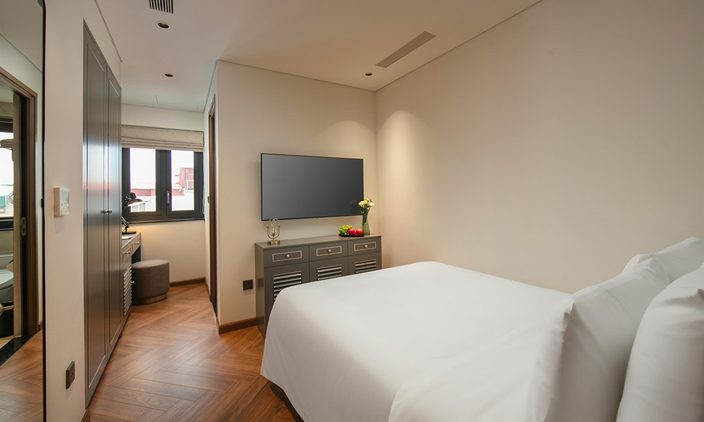 Không gian phòng hiện đại, nội thất trong phòng được lựa chọn tinh tế, gồm bàn làm việc tiện lợi, tủ quần áo rộng, TV màn hình phẳng và gương lớn tiện dụng cùng hệ thống chiếu sáng dịu nhẹ tạo cảm giác ấm áp. Phòng tắm đứng được ngăn cách bằng vách kính trong suốt, trang bị vòi sen hiện đại, hệ thống nước nóng ổn định, bồn rửa sứ trắng thanh lịch. Sàn gỗ cao cấp và cửa sổ đón sáng tự nhiên giúp không gian luôn thông thoáng và dễ chịu.