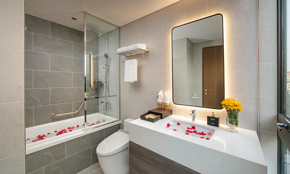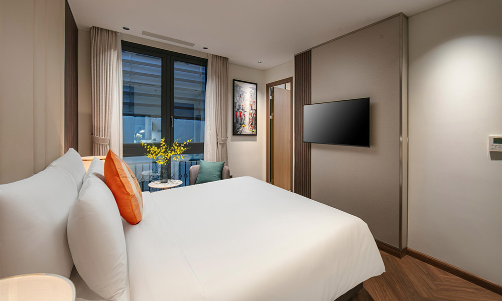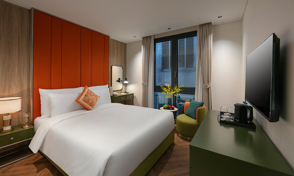 Phòng được thiết kế hài hòa với nội thất trang nhã, cửa sổ hướng phố đón ánh sáng tự nhiên cùng không gian nghỉ ngơi ấm cúng. Điểm nhấn là phòng tắm rộng rãi với bồn tắm lớn, giúp du khách thả mình trong làn nước êm dịu sau một ngày khám phá Hà Nội. Ngoài ra, phòng còn được trang bị đầy đủ tiện ích như Wifi tốc độ cao, điều hòa, tivi màn hình phẳng, minibar và bàn trang điểm, mang đến trải nghiệm lưu trú thoải mái và đáng nhớ.